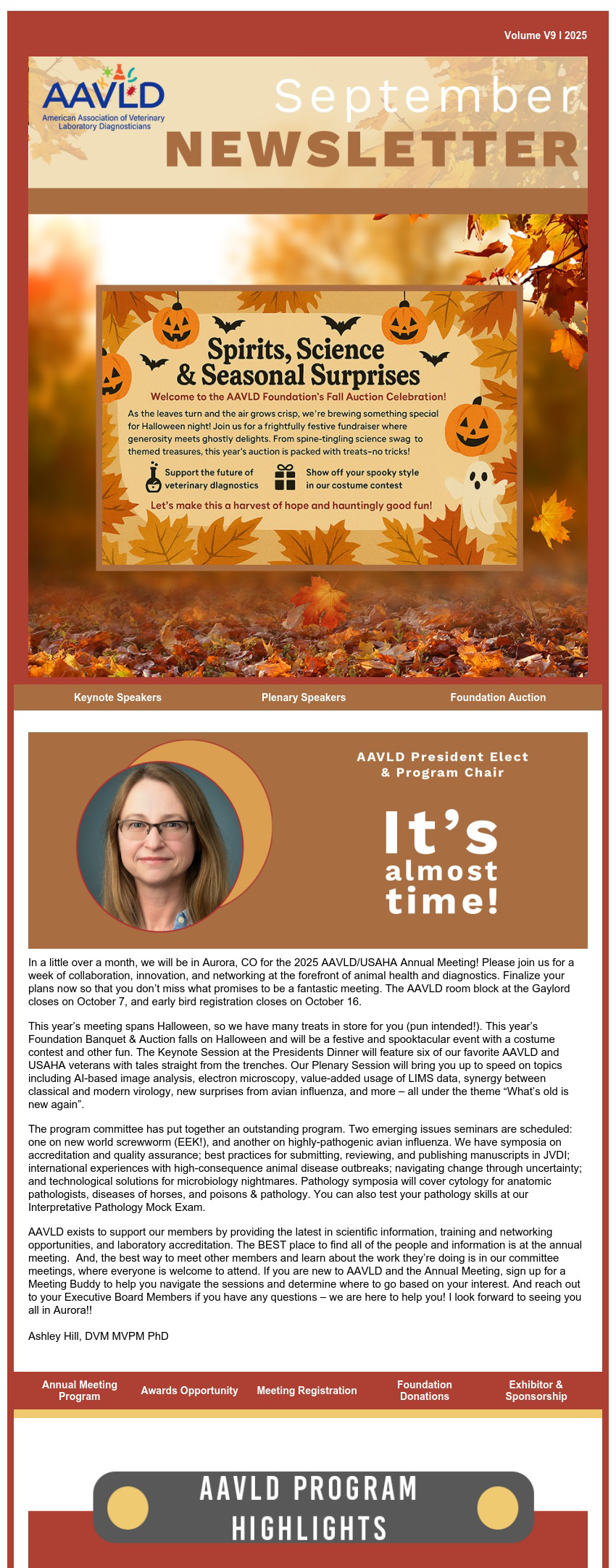Thank you to 2025 AAVLD Partners!AAVLD presents an opportunity for exhibitors and sponsors to display their latest veterinary laboratory supplies, equipment, and services to our meeting attendees. These meeting attendees are generally responsible for approving supply and equipment orders for state, federal, or private laboratories, agencies, and offices. AAVLD / USAHA Annual MeetingThe AAVLD annual meeting is held in conjunction with the United States Animal Health Association (USAHA) annual meeting in October/November each year. The 2025 meeting will be onsite this year. Hope to see you there!